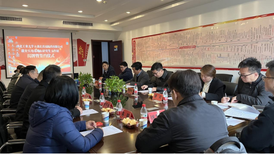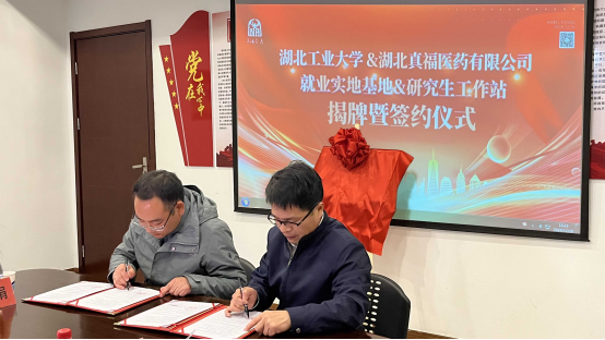 武漢真福創(chuàng)新生物制藥有限公司總經(jīng)理董艷山與湖工大生命科學與健康工程學院黨委書記王輝簽訂《碩士研究生聯(lián)合培養(yǎng)工作站協(xié)議書》。